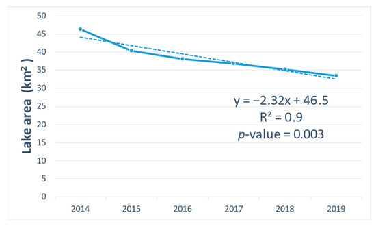Between 2014 and 2019, the mean area of dredged lakes had significantly decreased by 22% following an almost linear trend (Figure 5 and Figure 6).