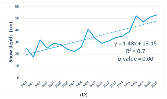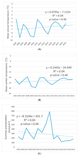 In contrast to mean annual and winter temperatures, summer precipitation (June, July, and August) decreased between 2005 and 2019, although it was very variable with a significant peak in 2013 (Figure 7C). The overall estimated decrease was about 120 mm. Over the slightly longer period of 2000 to 2019, snow depth (mean, November to March: data by Ob-Irtysh Department for Hydrometeorology and Environmental Monitoring) [48] showed a highly statistically significant change, with a more than doubling of the estimated snow depth from 20 cm in 2000 to 48 cm in 2019 (Figure 7D).