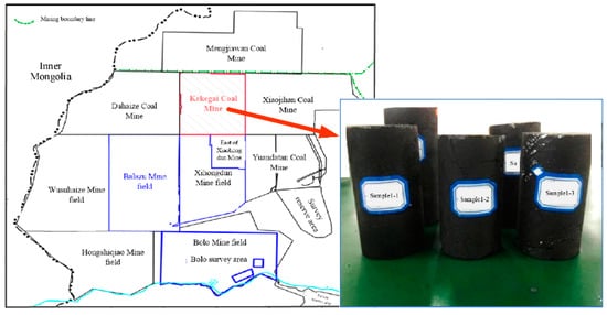 The coal rock sample was taken from the surrounding rock around the shaft of Coal Seam 2 in Kekegai Coal Mine, Yulin City, Shaanxi Province (see Figure 4). The coal rock density was 1.5 kg/m3, and the saturated water content was 14%. To explore the mechanical and seepage evolution characteristics of the coal pillar, hollow cylinder coal samples were made, as shown in Figure 5. The sample was processed into a coal core with a diameter of 70 mm and a length of 140 mm by the drilling sampler and rock cutter. Coal samples were put into the air circulation oven to dry for 12 h, and then the natural immersion method was used to obtain coal samples with different moisture contents.