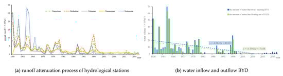 There are eight rivers in the BYDB, forming a fan-shaped river network, which flows into Baiyang Lake from west to east. After the ecological water supplement in recent years, Fu River, Xiaoyi River, and Baigou River flow all year round, while Zhulong River and Tang River have water in some seasons, and the water volume of other rivers is small. Baiyangdian Lake (BYD) is the largest freshwater wetland in North China Plain, with an area of about 366 km2, and it is a national key ecological wetland. The study area is shown in Figure 1. Since the 1950s, in order to strengthen flood control and drought resistance capacity, large-scale water conservancy projects have been built in the upstream mountainous areas to artificially retain water resources. In addition, there is the problem of excessive development of water resources. The development and utilization rate is as high as 130%, and the groundwater is seriously overdrawn. The water attenuation trends from 1956 to 2018 in the BYDB are shown in Figure 2. The aim of this study is to select a variety of methods to calculate the EF of the eight upstream rivers entering the lake with a division based on time and space, and the ecological flow process requirements under different ecological objectives to provide technical support for the ecological water replenishment and water ecological restoration in the BYDB.