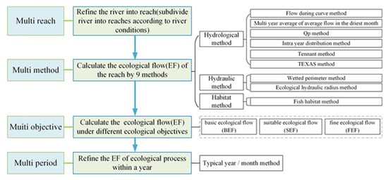 To determine the ecological and environmental flows, more than 207 methodologies have been developed at an international level in more than 55 countries. These methodologies can be grouped into four main groups: hydrological-based, hydraulic-hydrological (better known as hydraulic), habitat simulation, or ecohydraulic and holistic methods. The challenge at present is how to choose the most appropriate method and this depends on whether they comply with the currently valid principles or fundamentals. The main scientific principles on which the determination of an ecological flow regime is based are the paradigm of the natural hydrological regime and the gradient of the biological condition. To address these issues, this study will explore the premise and objectives of river EF calculation, and then integrate multiple methods to calculate river EF under multiple objectives. A refined calculation method of ecological flow division based on time and space is proposed in this study. Three commonly used methods, namely, hydrology methods, hydraulics methods, and habitat methods, are selected to finely calculate river EF in different periods, different reaches, and different ecological objectives. This approach breaks through the traditional EWR calculation method based on hydrology and develops a river EF calculation method based on ecological protection objectives.