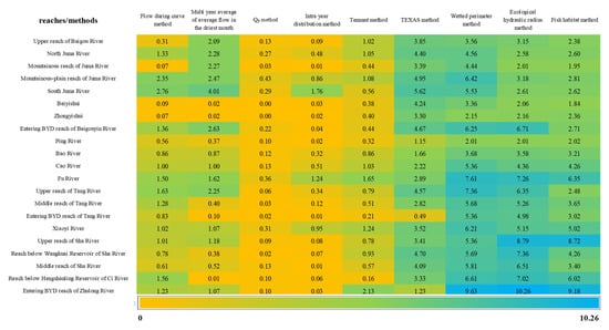 According to Table 2 and Figure 7, the calculation results of EF in the eight rivers entering BYD are as follows, the BEF, SEF, and FEF of each reach in the Baigou River are 0.07–2.86 m3/s, 0.10–7.91 m3/s, and 0.12~14.73 m3/s, respectively. For the Ping River, they are 0.95 m3/s, 2.56 m3/s, and 4.23 m3/s, respectively. For the Bao River, they are 1.68 m3/s, 4.60 m3/s, and 8.24 m3/s, respectively. For the Cao River, they are 2.21 m3/s, 6.09 m3/s, and 11.16 m3/s, respectively. For the Fu River, they are 3.39 m3/s, 9.39 m3/s, and 17.65 m3/s, respectively. For the Tang River, they are 1.63–2.19 m3/s, 4.46–6.03 m3/s, and 7.97–11.05 m3/s, respectively. For the Xiaoyi River, they are 2.72 m3/s, 7.52 m3/s, and 13.96 m3/s, respectively. For the Zhulong River, they are 1.01–3.87 m3/s, 2.73–10.74 m3/s, and 4.56–20.29 m3/s, respectively. In terms of spatial distribution, the Ping River has the lowest demand and the Zhulong River has the largest demand for ecological flow.