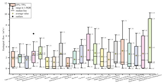 The BEF of the 21 reaches calculated by nine methods are analyzed by drawing a heat map. It can be seen from Figure 5 that the calculation results of hydraulic methods and habitat methods are generally greater than those of hydrological methods. The calculation principles of the first two methods are river section parameters (width, roughness, slope coefficient, etc.) and ensuring certain habitat conditions (flow velocity, water depth, etc.), thus the BEF is large. The principle of hydrology-based methods is to calculate the ecological water demand based on the historical flow. A small historical flow leads to a small calculation result of EF. When the flow demand of each of the eight rivers is considered, the ecological flow demands of the Baigou River and Zhulong River are larger, those of the Fu River, Tang River, and Xiaoyi River are second, and those of the Ping River, Bao River, and Cao River are the least. Through analyzing the quantiles of the results calculated by the nine methods, a box diagram (Figure 6) is drawn to clearly and intuitively see the range of values in each reach. Using Formula (2), a unique value is selected as the BEF demand of every reach, as shown in Table 3.