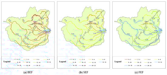According to the calculation standard of the Tennant method, the basic ecological water demand in a river is set as follows: 10% of the multi-year average monthly flow is taken as the basic ecological water demand in the dry season (October to May of the next year) and 20% of the multi-year average monthly flow is taken as the basic ecological water demand in the wet season (June to September). The suitable ecological water demand is set as follows: 20% of the multi-year average monthly flow is taken as the suitable ecological water demand in the dry season and 40% of the multi-year average monthly flow is taken as the suitable ecological water demand in the wet season. The fine ecological water demand is set as follows: 40% of the multi-year average monthly flow is taken as the fine ecological water demand in the dry season and 80% of the multi-year average monthly flow is taken as the fine ecological water demand in the wet season. Learning from the calculation idea of EF under different objectives by Tennant, the BEF is taken as the benchmark to calculate the SEF and FEF. The results are shown in Table 3. The spatial distribution of EF of each reach under a multi-objective approach is shown in Figure 7.