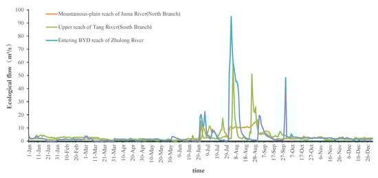 The typical year/month method is employed, i.e., formula (8), and the EF in 21 reaches is refined to the daily process demand. In this paper, three typical reaches are selected, the North Branch, the South Branch, and the Flowing-into-the-BYD reach, respectively. Taking the mountainous-plain reach of the Juma River in the North Branch, the upper reach of the Tang River in the South Branch, and the Flowing-into-the-BYD reach of the Zhulong River in the plain area as examples, the annual (daily) ecological water demand process is shown in Figure 8. The EF demand in the mountainous-plain reach of Juma River is small, and the demand is the largest in August of the year. The average value in August is 10.44 m3/s, and the maximum value is 16.4 m3/s. The EF demand in the upper reach of the Tang River is at a medium level. The demand is the largest in early and late August of the year, with an average value of 11.98 m3/s and a maximum value of 58.9 m3/s in August. The EF demand of the Flowing-into-the-BYD reach of the Zhulong River is the largest. The demand is the highest in early August and the end of September. In August, the average value is 21.33 m3/s and the maximum value is 94.9 m3/s, while in September, the average value is 6.36 m3/s and the maximum value is 48.3 m3/s.