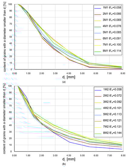The collected samples were subject to granulometric analysis in the geotechnical laboratory of the Koszalin University of Technology. For this purpose, a Micro LAB sieve shaker (model: LPzE-2e) was used. Measurements were made using the “dry” method for all sediment samples. The samples were dried at 100 ± 0 °C for 24 h before granulometric analysis. Examples of measured grain size distributions for flows of 8 L/s and 14 L/s are shown in Figure 4.