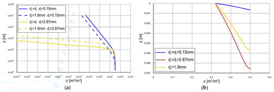 In the Figure 9a,b it is seen that velocity and concentration vertical profiles reach the highest values in the contact layer for the smallest grain diameter and gradually decrease with increasing diameter of the grains. All concentration profiles start with at the upper limit of dense layer. The velocity profiles, according to Figure 8, start from the calculated value for coordinate which is set at this boundary. The ordinate increases with the grain diameter increase. It is worth noting that the velocity profile in the contact layer is connected to the logarithmic velocity profile at the upper boundary of this layer. The calculated logarithmic velocity distributions for the coarse fractions are stopped in Figure 8 at the levels where concentrations of these fractions reach negligibly small values.