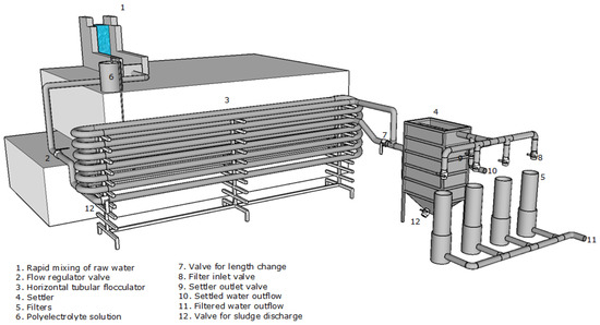 However, despite the advantages that this type of flocculators has presented in numerous industrial processes, in recent decades, no information has been presented about the application of tubular flocculators for drinking water and wastewater [20]. In previous studies, tubular flocculators have been evaluated when applied to wastewater, and other studies have been carried out at the laboratory and batch levels. There is a gap in the evaluation of tubular flocculators for drinking water at the field scale with continuous flow. Therefore, one of the objectives of the present study was to bridge the gap between laboratory tubular flocculation research and field research, contributing new knowledge in this research area and demonstrating that tubular flocculation is an alternative solution for small and medium-sized communities.