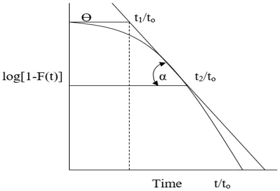 The values of the unknowns θ and tan α are obtained by plotting the curve on a semilogarithmic scale [1−F(t)] on the ordinates and as a function of dimensionless time (t/to) on the abscissas, resulting in a line that forms an angle with the horizontal, as is described in Figure 2. The values of the remaining fraction are in logarithmic form, while those of dimensionless time t/to are in arithmetic form. A tangent line is drawn at the point where the line begins to turn vertically. α is the angle between the tangent line and the horizontal and Ɵ is the intercept of the line with the abscissa axis, obtaining Equation (9) and θ = p (1 − m) [28,31].