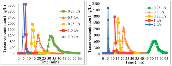 Once the tracer test was applied, the mean retention times (MRT) were calculated. These values can be seen in Table 1. As the operational flow decreases, the retention time in the reactor increases. For the same flow rate and length, the different theoretical retention times (TRT) and mean retention times (MRT) do not differ much. For the MRT analysis, the minimum retention time for flocculation was taken into account according to Garland et al. [42], which is between 10 and 30 min. For the length of 68.4 m, only the flows of 0.5 and 0.75 fulfilled the condition of the minimum retention time of 10 min. For the length of 68.4 m with a flow rate of 1.0 and 2.0 L/s, the minimum time of 10 min for both the MRT and the TRT is not met. For the two lengths of the HTF and the same flow rate of 2 L/s, both the MRT and TRT are less than the retention time recommended for conventional flocculators by the different authors cited by Romero [23], due to the fact that the flocculator worked with a double flow rate compared to the design flow rate in this case.