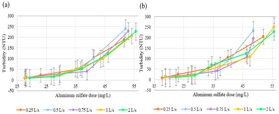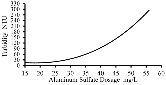 As mentioned above, the dose of coagulant applied to the experimental treatment system was determined by jar tests [35]. The agitation time that was applied in the jar tests was taken from the results of the tracer tests (the time was taken for a length of 97.6 m and a design flow rate of 1 L/s). Meanwhile, the velocity gradient applied in the jar test was obtained from Equation (12). The jar tests were carried out using a Phipps and Bird six-blade programmable blender (The equipment was lent by the drinking water company of the city of Azogues, EMAPAL). The dose of coagulant (aluminum sulphate) was determined for each one of the different turbidities of the raw water that was obtained during the year of experimental tests [36].