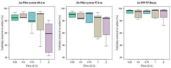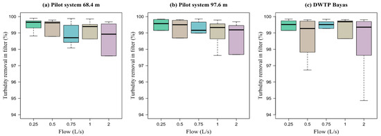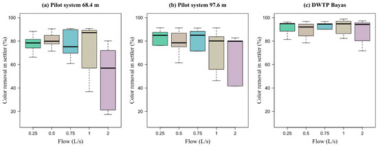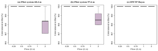 Equation (17) proposed by Oliveira and Teixeira [24] allowed us to determine the percentage of turbidity and color removal from the systems. The removal efficiency (RE) of turbidity and color was calculated in each experimental test carried out, obtaining average removal values at the settler outlet and the filter outlet, both from the pilot system and the Bayas DWTP.