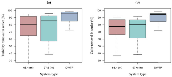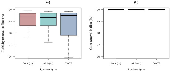 Using the values of the turbidity and color removal efficiency, a box plot was made, using the length of 68.4 m and 97.6 m of the HTF. Likewise, a box plot was made with the removal values obtained from the DWTP. These box plots permitted us to analyze the turbidity and color removal efficiency of the Bayas DWTP settler vs. the pilot settler, as well as the turbidity and color removal efficiency of the Bayas DWTP filter vs. pilot filter. The R Studio program was used for the described analysis.
