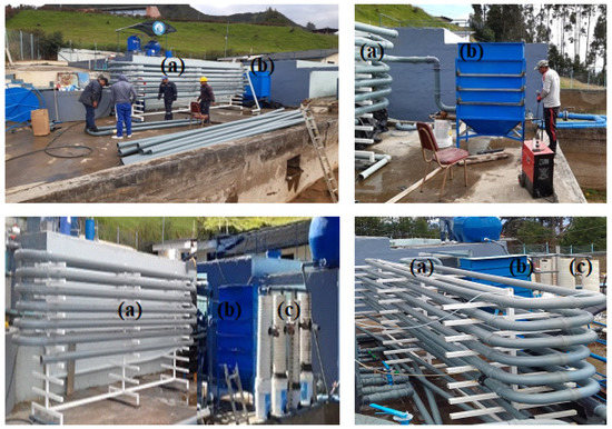 Implementation of the Pilot Treatment System. The upper left figure shows the HTF implementation; in the upper right, the implementation of the settler is presented. The complete experimental system is presented in the lower left and right figures, as follows: (a) HTF, (b) high-rate settler, and (c) rapid sand filters.