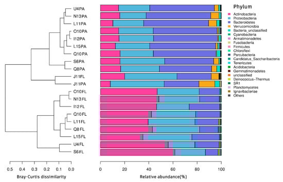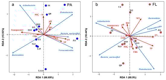 - Yang, Y.; Chen, C.; Wang, J.; Xu, T. Characterizing free-living and particle-attached bacterial communities of a canyon river reservoir on the Yungui Plateau, China. Front. Microbiol. 2022, 13, 986637. [Google Scholar] [CrossRef] [PubMed]