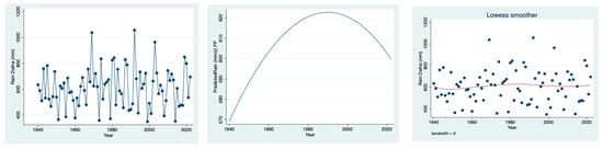 Temporal (1940–2022) fluctuations of annual rainfall (mm) measured in the northern part of the Hula valley (Dafna): scatter plot (left), fractional polynomial regression (middle) and lowess smoother trend of changes (right).