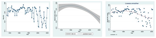 Temporal (1940–2022) fluctuations of annual minimal altitude (mbsl) of water level (WL) in Lake Kinneret: scatter plot (left), fractional polynomial regression (predicted value) (middle) and lowess smoother trend of changes (right).