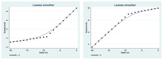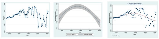 Three methods of regression were performed (STATA 17): (1) fractional polynomial regression (Predicted value and CI 95%, where the grey color space (within the CI) overlap indicates the nonlinearity of the prediction, and (2) trend of changes—lowess smoother (0.8 bandwidth), and fractional polynomial regression.