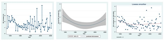 The results given in Figure 3 represent rainfall range fluctuations during 82 years (1940–2022) measured at Dafna station located in the northern part of the Hula valley. The results indicate a long term from 1940 to the late 1980s of enhancement followed by a let decline. The fluctuated amplitude (up and down) ranged annually between 30–50 mm as indicated by the predicted fractional polynomial regression and lowess smoother trend of changes.