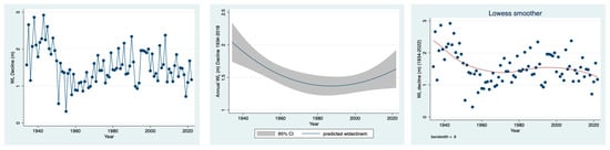 Temporal (1940–2022) fluctuations of annual water level decline (m) in Lake Kinneret: scatter plot (left), fractional polynomial regression (predicted value) (middle) and lowess smoother trend of changes (right).