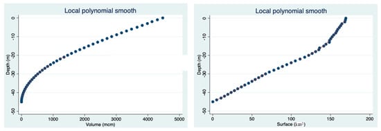 Theoretical (Synthetic values) hypsometric curve in shallow lakes: surface change vs. depth (left) gradient is flat in the depth and steeper in the shallows. Vice versa of volume changes (right): volume change vs. depth-gradient is flat in the shallows and steeper in the depth.