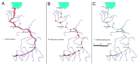 Maps of the location of sampling sites on the Vistula River used in this paper: (A) Measurement points for the Vistula River scientific expedition with the use of multi-parameter probes on 18–31 July 2022; (B) Sampling sites for analysis performed in accredited laboratories; (C) Sampling sites of the General Inspectorate of Environmental Protection (GIOŚ) on the Vistula in the 2016–2019 period which were used in the analysis.