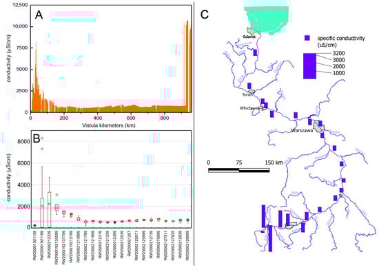 Analyses of specific conductivity measured with the multi-parameter probes Xylem YSI ProDSS and YSI EXO2: (A) Variability of the conductivity along subsequent kilometers of the Vistula (high conductivity in section 940–980 was recorded in the Martwa Wisła River and resulted from the large inflow of Baltic waters, hence, these measurements were not included in the analyses); (B) Variability of specific conductivity in the JCWP (squares—median, boxes—first and third quartile, whiskers—minimum and maximum values, circles—outstanding values; (C) Map of specific conductivity variability in the JCWP.
