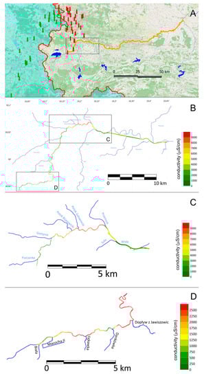 Map of the variability of specific conductivity in the waters of the Little Vistula. Values determined on multi-parameter probes Xylem YSI ProDSS and YSI EXO2, taken during an expedition on the Vistula River on 18 July 2021: (A) Map of the Little Vistula. (B) The specific conductivity variability in the area of the Little Vistula. (C,D) Areas with greatest salt water load. Red and green arrows show the locations of mine water dumps on Oder River catchment area (green area) and Vistula River catchment area (rest of map area). Map background licensed by the OpenStreetMap Foundation.