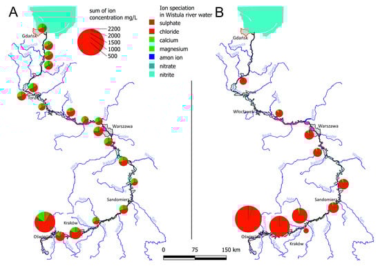 The resulting salt concentration will be higher the lower the river flow for the same amount of salt delivered pointwise to the river. Hence, there are high salt concentrations in the water of the Vistula River in its upper reaches loaded with the inflow of saline water from coal mine drainage. For the same reason, in the lower reaches of the Vistula, despite the inflow of saline waters, the salt concentrations in the river are relatively low (due to the high river flow). However, in return, high salt loads are observed in the lower reaches. The conducted research showed that discharges of saline waters influenced the salinity of the Vistula River along the entire section of the river. It is well known that high salt concentrations in the river’s upper course affect the downstream or even the whole catchment area [28,29]. The change in the ionic composition in the lower course of the Vistula River should be emphasized, where chloride ions dominate in the upper course, while the share of sulphates, Ca and Mg ions increases in the lower course.