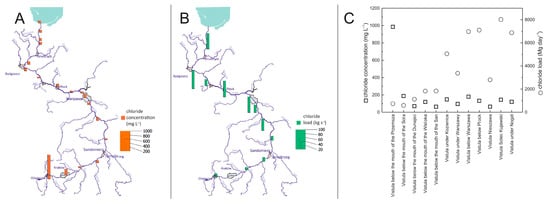 Changes in: (A) Chloride concentration in Vistula River; (B) Chloride loads in Vistula River; (C) Comparison of concentrations (squares) and loads (circles) of chloride in the Vistula River waters from Goczałkowice to the mouth part of the Vistula River, based on measurements with Xylem YSI ProDSS and YSI EXO2 multi-parameter probes. Loads were determined based on flow measurements in Vistula River cross-sections.