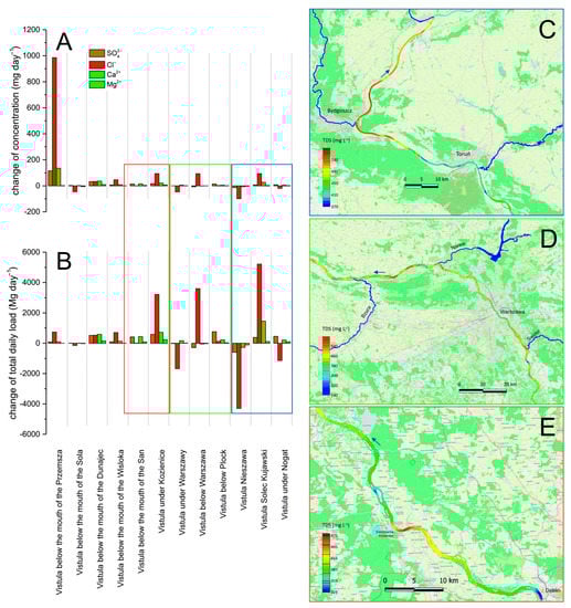 Changes in concentration (A) and loads (B) as well as speciation of ions accountable for the salinity of the Vistula River water in the section from Goczałkowice to the mouth part of the Vistula River based on the analysis of waters collected during the scientific expedition. The color of the three boxes in charts A and B corresponds to the color of the borders of the maps showing the corresponding sections of the Vistula River (C–E). Map background licensed by the OpenStreetMap Foundation.