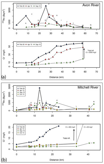 Appendix B.2. Comparison in between 222 Rn and Cl in the Mitchell River and the Mitchell Plains
