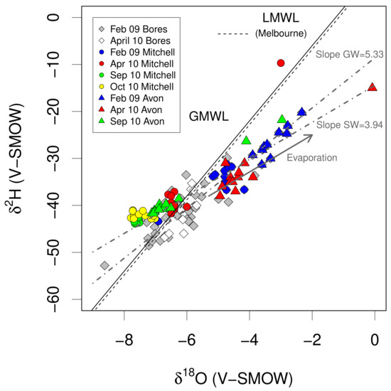 - Martinez, J.L.; Raiber, M.; Cox, M.E. Assessment of groundwater–surface water interaction using long-term hydrochemical data and isotope hydrology: Headwaters of the condamine river, southeast queensland, australia. Sci. Total Environ. 2015, 536, 499–516. [Google Scholar] [CrossRef]