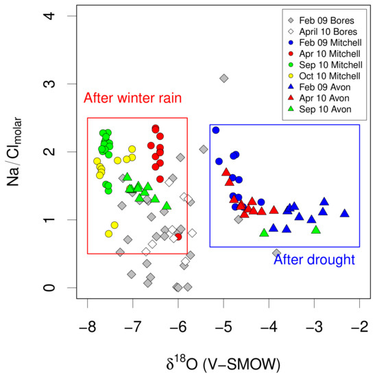 - Cartwright, I.; Weaver, T.R.; Fifield, L.K. Cl/Br ratios and environmental isotopes as indicators of recharge variability and groundwater flow: An example from the southeast Murray Basin, Australia. Chem. Geol. 2006, 231, 38–56. [Google Scholar] [CrossRef]