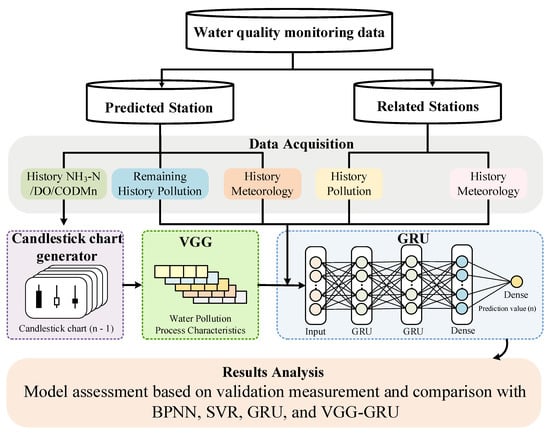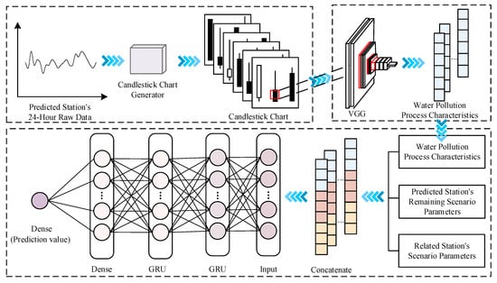 The chronological change law of the water quality data at the target station was reflected by the candlestick theory. The classification features in the candlestick chart could be fully and efficiently extracted by VGG. Because of the long-term learning dependency of GRU, the long-term correlation of water quality data was able to be captured, and the periodic pattern of water quality data over a long period could be accessed. Therefore, based on the candlestick theory, VGG, and GRU, the CT-VGG-GRU hybrid model was used to simulate the continuous transmission process of water pollution. Its structure is shown in Figure 6. First, the VGG model was used to filter the classification features of the candlestick chart in advance, reflecting the water pollution transmission process. Then, the extracted features were combined with the scenario parameters of each station, which together served as the input of the GRU model. Finally, the GRU model was used to reflect the continuous water pollution process and achieve accurate predictions of the water quality data.