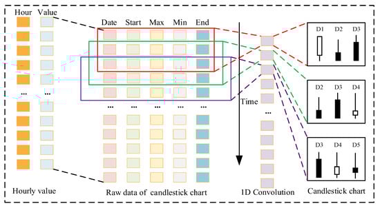 The candlestick chart generator was designed to reflect the data changes of water quality during the period, and its principle is shown in Figure 3. The basic period was set to 24 hours, and the candlestick chart was generated by the initial, lowest, highest, and end values of the basic period. The continuous characteristics in the process of water quality change were reflected, which was based on the convolution idea of the CNN. Only time was convolved sequentially, and a day was set as a time unit. The water quality data formed a candlestick graph every three days by setting the sliding window size to three days, and the sliding step to one day. Therefore, the data of the 123, 234, 345, …, N – 1, N, and N + 1 days were used as the candlestick chart combination, corresponding to the continuous pollution process of water quality.