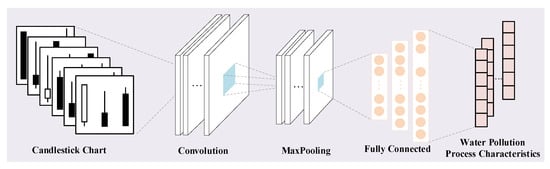 The VGG network model, proposed by the Oxford Visual Geometry Group, is adapted from the CNN mode, which can be widely used to extract image features and save key information [35]. The characteristics of the candlestick chart extracted by VGG are shown in Figure 4. The local features of water pollution were extracted by the convolutional layer, which corresponded to the pollution transfer process. The pollution on the first day would affect the pollution on the second and third days, and such features were extracted by the convolutional layer. The extracted feature was further strengthened by the pooling layer, where only strong features were retained and weak features were discarded, which improved the accuracy of the pollution process classification. The global classification information of water pollution was integrated by the fully connected layer, which was equivalent to the pollution process classifier [36].