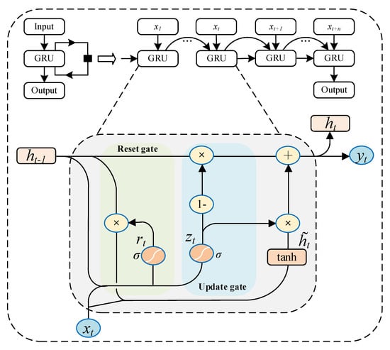The characteristic information of the water pollution process was extracted by VGG, combined with other scenario parameters of each station for time series prediction. The GRU network, which is a time series model improved and optimized based on LSTM, was adopted as the time series part of the model. Its structure is shown in Figure 5. Compared with LSTM, GRU has two gate structures: a reset gate and an update gate. The reset gate was used to control the degree of ignoring the water quality information at the previous moment—that is, the influence degree to which the water quality information at the previous moment on the current moment reflected the transmission process of water pollution. The update gate was used to control the degree to which the water quality information for the previous time was retained to the current state. The information for the previous time step and the current time step would affect the future water quality, which fully reflected the advantages of GRU in processing water quality time series data [38]. A special feature of these two gating mechanisms was that the water quality information in the long-term sequence could be saved and, thus, it would not be cleared over time or removed, making it irrelevant to the prediction [39].