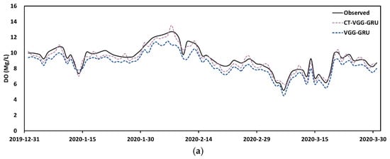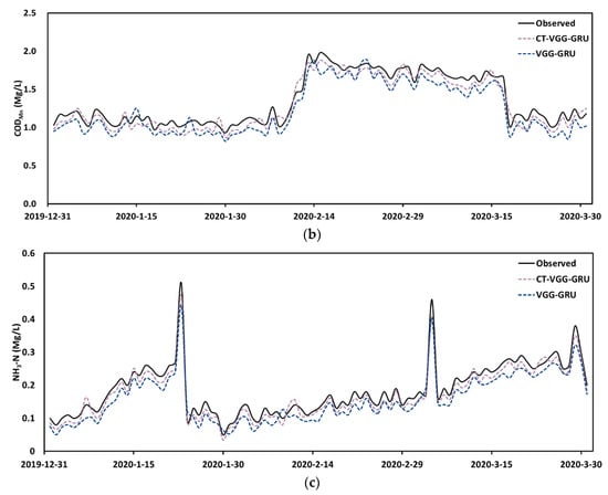 The indicators of water quality—DO, CODMn, and NH3-N—were selected as the performance evaluation indicators of the established CT-VGG-GRU model in this part. The online monitoring data from January 2012 to December 2019 were used to train the model, and the daily mean values of DO, CODMn, and NH3-N concentration from January 2020 to March 2020 were predicted. Among them, the hourly values of DO, CODMn, and NH3-N concentration from January 2012 to December 2019 at the Yangshuo station were used as the benchmark training dataset of the VGG. After training and convergence, the optimal model weight of CT-VGG-GRU was obtained. To verify the predictive accuracy of the optimal model, the test dataset was used for model evaluation. As shown in Figure 7, the predicted values of DO, CODMn, and NH3-N from January 2020 to March 2020 were compared with the real values. Compared with the VGG-GRU model, the proposed model showed accurate prediction performance in the whole prediction range, even when the pollutant concentration was mutated, indicating that the model could well process nonlinear characteristics and mutation of time series.