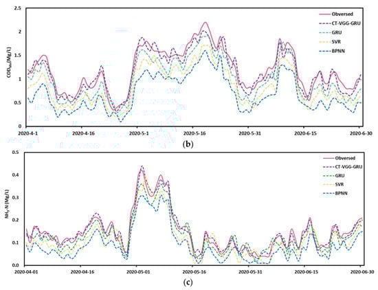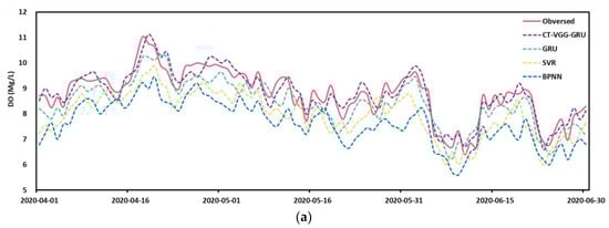 Under the same conditions, the DO, CODMn, and NH3-N concentrations predicted by different models including BPNN, SVR, GRU, and CT-VGG-GRU are shown in Figure 8. The online monitoring data from January 2012 to March 2020 were used to train the model, and the daily mean values of DO, CODMn, and NH3-N concentration from April 2020 to June 2020 were predicted. Among them, the hourly value of DO, CODMn, and NH3-N concentration from January 2012 to March 2020 at the Yangshuo station was used as the benchmark training dataset of VGG. Through comparative analysis, the proposed method was superior to the mainstream methods such as SVR and GRU. The higher prediction accuracy than that of other methods might be due to two reasons. First, the strong robustness, memory ability, self-learning ability, and nonlinear mapping ability of the neural network were helpful to better predict water quality indicators. Second, the deep learning model based on the candlestick theory was sensitive to local change information, which improves the accuracy of extreme value prediction.