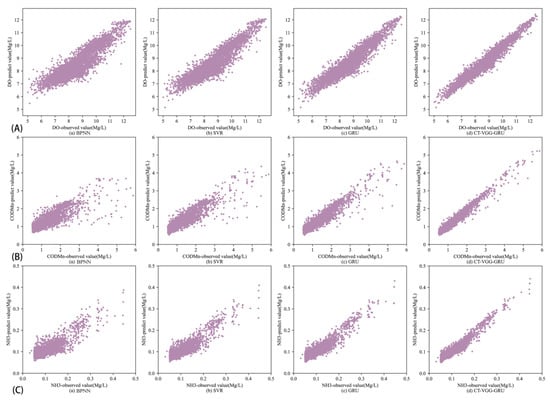 Scatter plots of comparison models: (A) DO, (B) CODMn, (C) NH3-N.