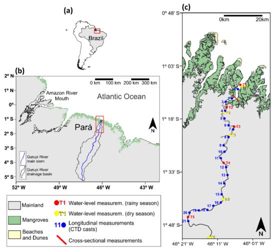 The Gurupi estuary is a large tide-dominated estuary in the eastern sector of the Amazon coast. This estuary provides an excellent opportunity to study the influence of river flow and the ARP on the hydrodynamics and morphodynamics of a macrotidal system. Recent research has been conducted on sediment dynamics and tidal propagation [,,,]. This study will evaluate how the large catchment area and high river discharge affect the hydrodynamics and morphology of the Gurupi River estuary. Additionally, we investigate the seasonally varying, fine-sediment contribution from the Amazon River Plume.