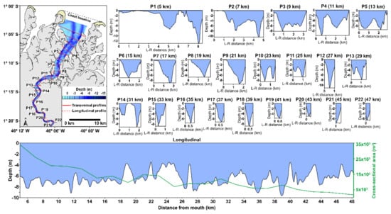 Bathymetric profiles showing the morphology of the Gurupi estuary. The red lines show the location of the transect. The green line shows the variation of the cross-sectional area along the estuary. Seasonal bottom morphology changes are not considered.