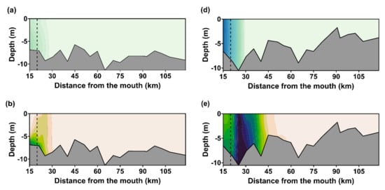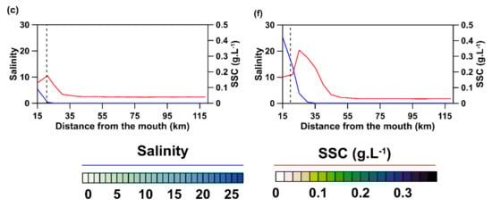 Suspended sediment concentration (SSC) and salinity were higher near the mouth. However, values were seasonally different. During the rainy season, SSC values ranged from 0.17 g · L−1 to 0.03 g · L−1, from the mouth to the head of the estuary. Furthermore, the greater SSC values were recorded near the mouth and a concentration of 0.04 g · L−1 was consistently recorded along the middle and upper estuary. The observed salinity varied between 5.4 in the lower estuary to ~0 at ~30 km (Figure 3a–c).