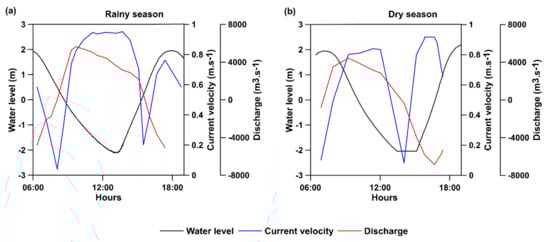 During the dry season, the maximum total discharge was greater during the ebb (5647 m3 · s−1) than during the flood phase (5505 m3 · s−1). The maximum current velocity was 0.84 m · s−1 and 0.93 m · s−1 during the ebb and flood phases, respectively (Figure 4b).