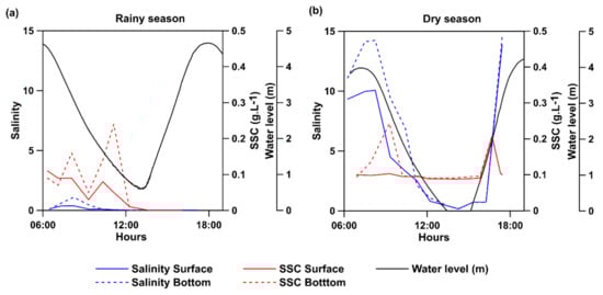 Vertical (surface–bottom) variations of salinity and SSC were observed in both seasons with greater values near the bottom for both variables. As expected, the salinity level was consistently greater during the dry season. At the transect locations, thew salinity values were close to zero during the rainy season and reached 14.5 during the dry season. For the dry season, variations along the tidal cycle follow the expected pattern of higher values during the flood, in comparison with the ebb phase (Figure 5b). For the rainy season, there was a small peak of salinity (i.e., 1.09) during the beginning of the ebb, which is associated with the flushing of large mangrove areas with salt-rich sediments (Figure 5a). Further, surface–bottom variations were noticeable, especially during the dry season, when differences reach up to five between the saltier bottom waters and the surface, during the onset of the ebb phase.
