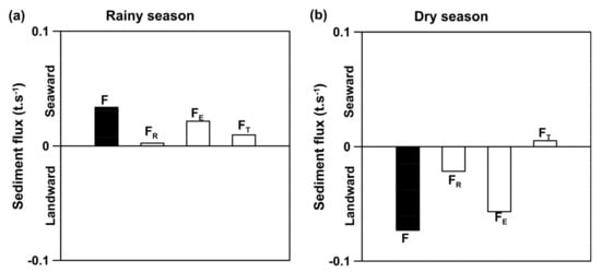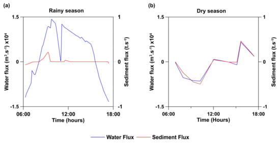 The sediment flux for the rainy season ranged from −0.06 t · s−1 to 0.21 t · s−1, indicating processes of importation and exportation, respectively. The mean sediment flux was 0.07 t · s−1, indicating net sediment export to the estuary. The sediment flux during the dry season ranged from −0.49 t · s−1 (import) to 0.46 t · s−1 (export). The mean sediment flux was −0.07 t · s−1, indicating net sediment import to the estuary.