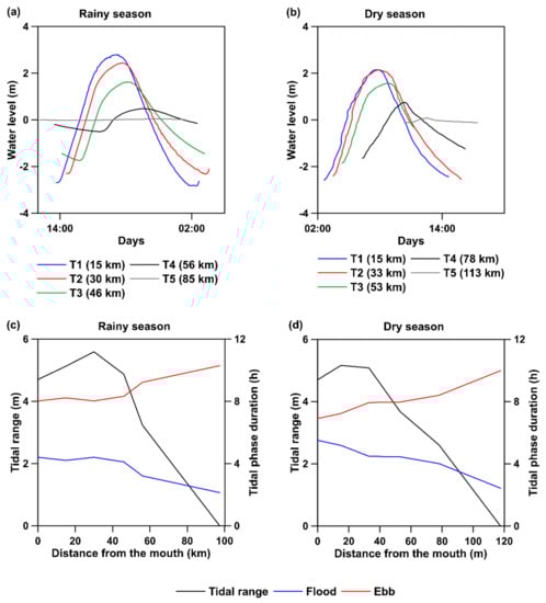 Water level oscillation along the Gurupi estuary. Panels (a,b) show the oscillation during rainy and dry seasons, respectively. Panels (c,d) show the longitudinal variation of tidal range and tidal phase duration during rainy and dry seasons.