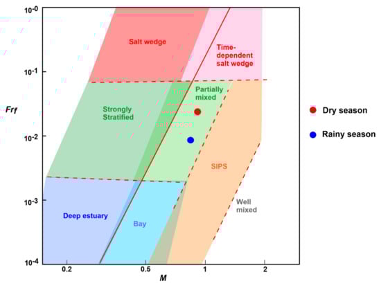 The estuarine circulation and salinity structures were classified using the parameterization proposed by [], also applied in [,]. According to [], this parameterization allows the classification of estuaries using the principal forcing variables, the tidal velocity, and the freshwater flow. This classification relies on the freshwater Froude number and the Mixing number. The freshwater Froude number represents the fluvial forcing (freshwater input) and is calculated as follows: