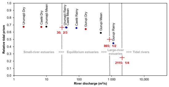 Correlation of relative tidal prism and fluvial discharge of the Gurupi estuary based on the seasonal variations of fluvial discharge, in comparison to the Caeté and Urumajó estuaries (data from []). The red circles represent the dry season, the blue circles represent the rainy season and the black circles represent the mean river discharge values. River discharge is represented in a logarithmic scale.
